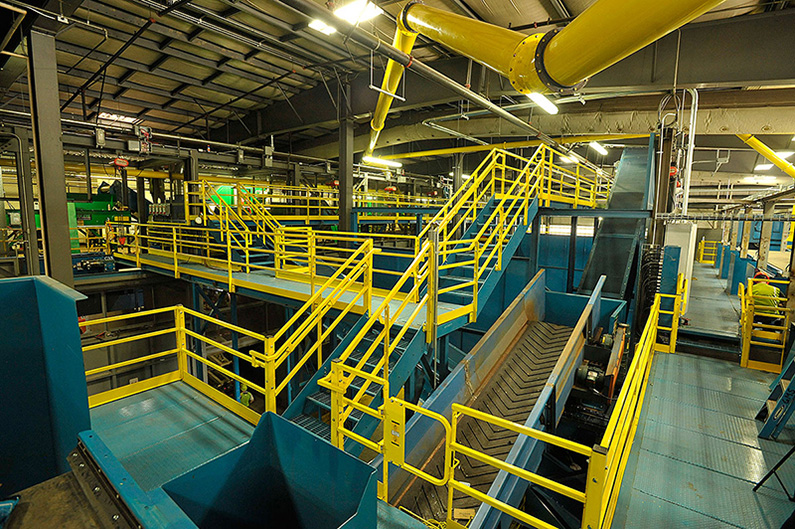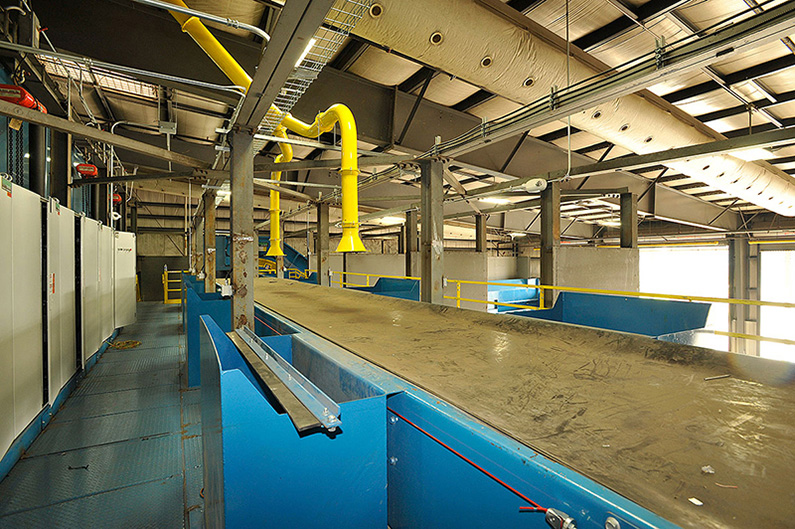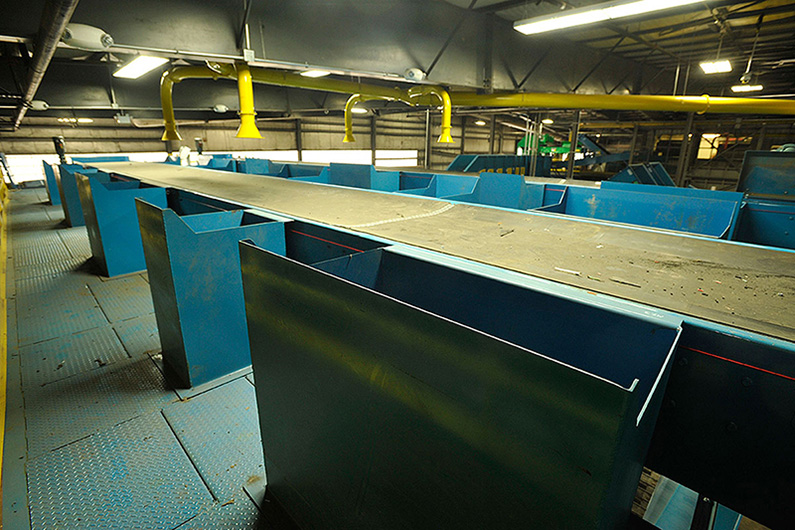 View of fiber sort line. Recycling staff will sort separated materials into the proper bins at this location.