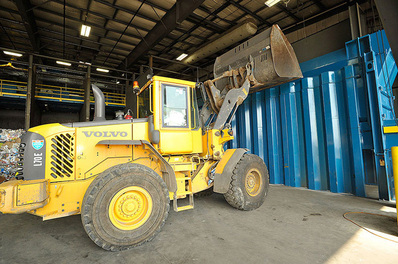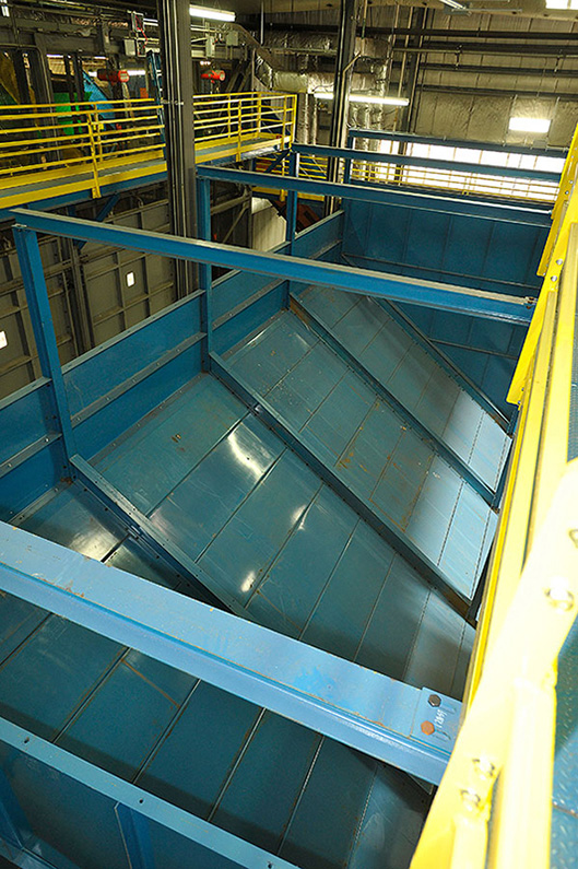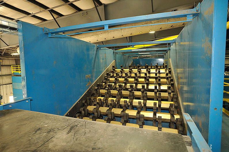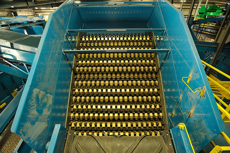 Large metering bin is loaded with mixed recyclables at the start of the single-stream system.