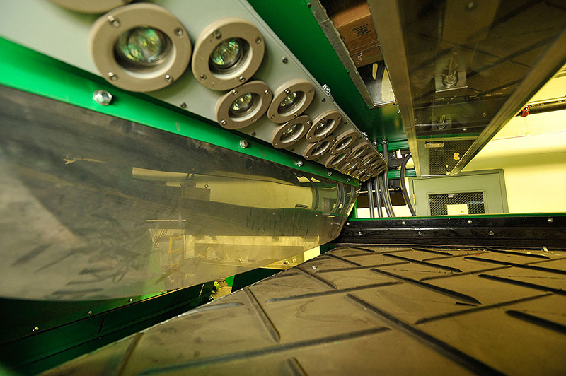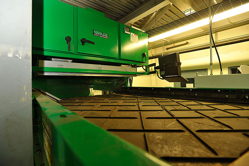 Green Eye Optical Sorting Systems high speed accelerator belt. Travels at 500 feet per minute and evenly disperses material load so that optical sensors can identify isolated containers for sorting.